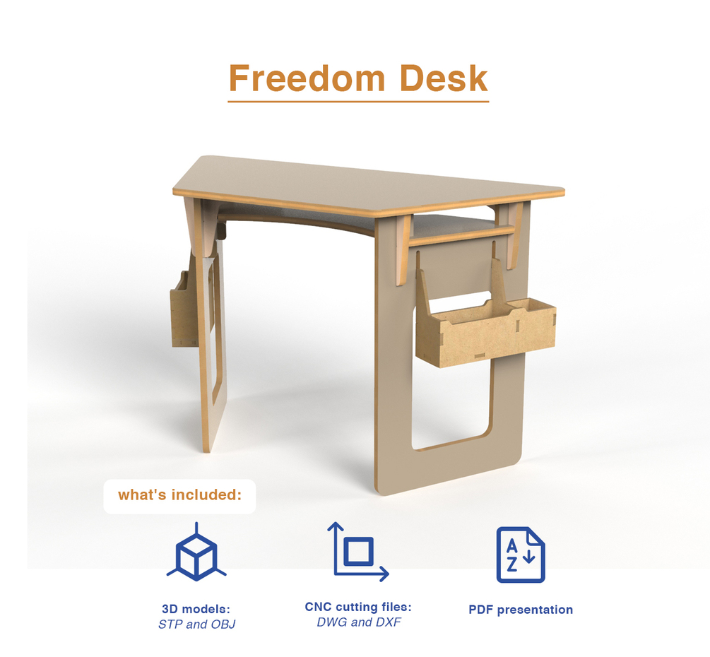 2) CNC cutting files on standard MDF board in formats 122 Cm x 244 Cm (48.03 in x 96.06 in) thicknesses of 18mm (desk) and 9mm (accessories).
